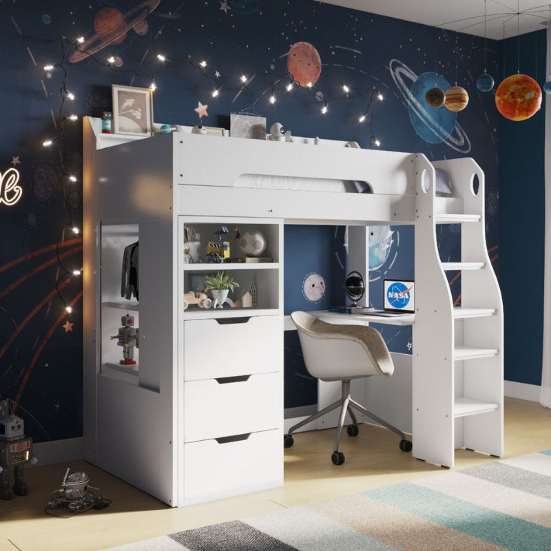 The Flair Cosmic Storage Sleeper Bed is a smart all-in-one kids bed that combines sleep, study and storage in one space-saving design. Ideal for smaller bedrooms, this high sleeper features a built-in desk, drawers, shelving and a wardrobe, creating an organised and practical bedroom solution for growing children.